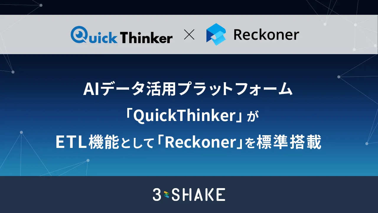 株式会社スリーシェイク(本社:東京都新宿区、代表取締役社長:吉田 拓真、以下スリーシェイク)はATIRO 株式会社(本社:東京都中央区、代表:織田 慎弥、以下ATIRO)が提供するAIデータ活用プラットフォーム「QuickThinker(クイック・シンカー)」に、スリーシェイクのデータ連携ツール「Reckoner(レコナー)」が標準搭載されたことをお知らせします。