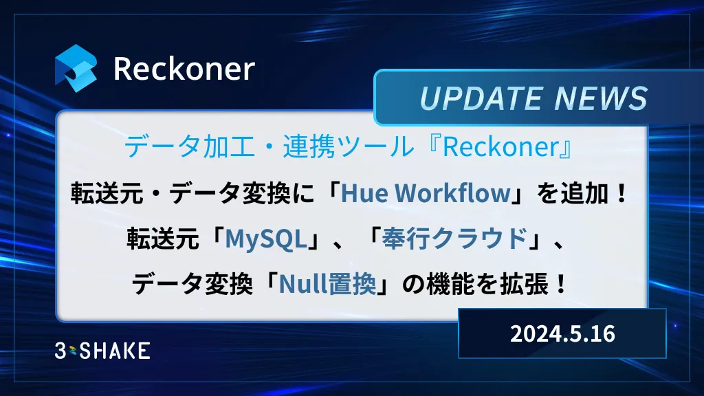 転送元・データ変換に「Hue Workflow」を追加しました。転送元「MySQL」、「奉行クラウド」、データ変換「Null置換」の機能を拡張しました。