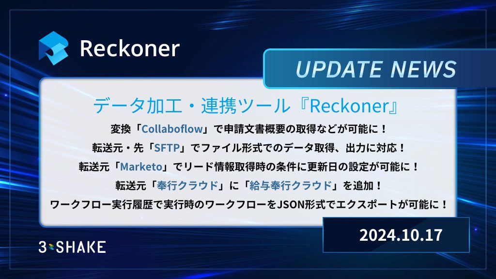 変換Collaboflowを追加、ワークフローのエクスポート機能、SFTP、Marketo、奉行クラウドの機能拡張を行いました