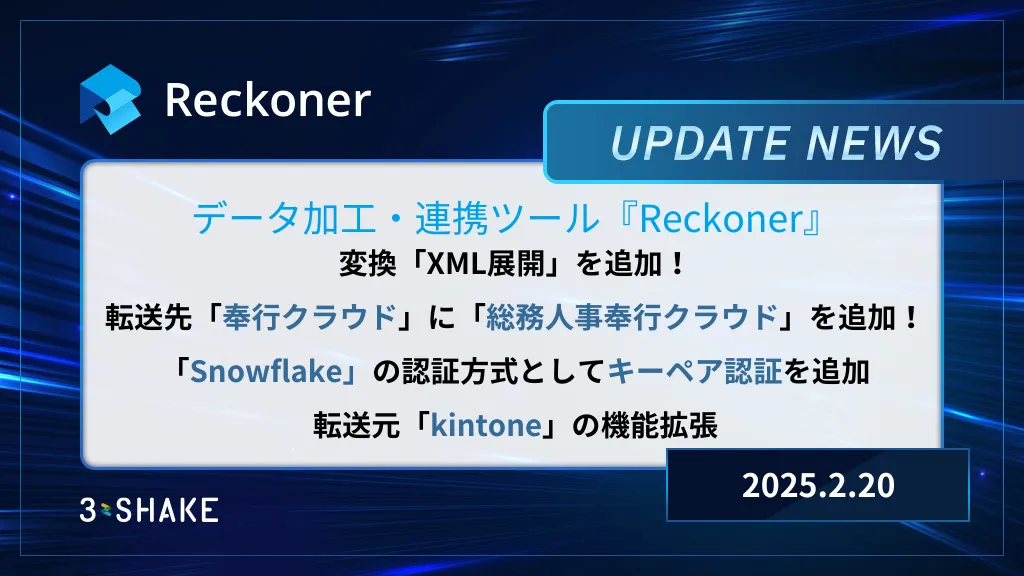 変換XML展開、転送先奉行クラウドに「総務人事奉行クラウド」を追加、Snowflakeの認証方法、転送元kintoneの機能拡張を行いました