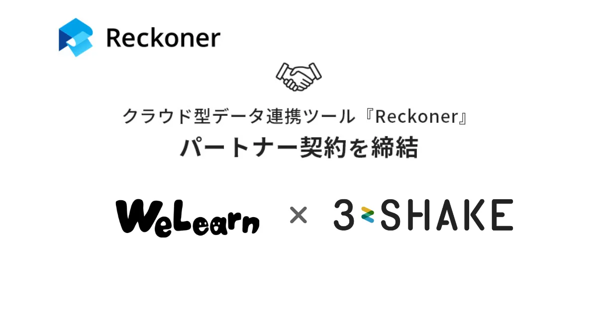株式会社スリーシェイク(本社:東京都新宿区、代表取締役社長:吉田 拓真、以下スリーシェイク)は、WeLearn株式会社(本社:東京都千代田区、代表取締役 CEO:山口 寛太、以下WeLearn)と、クラウド型データ連携ツール「Reckoner(レコナー)」において、パートナー契約を締結したことをお知らせします。
